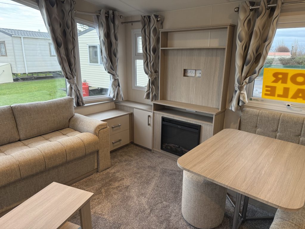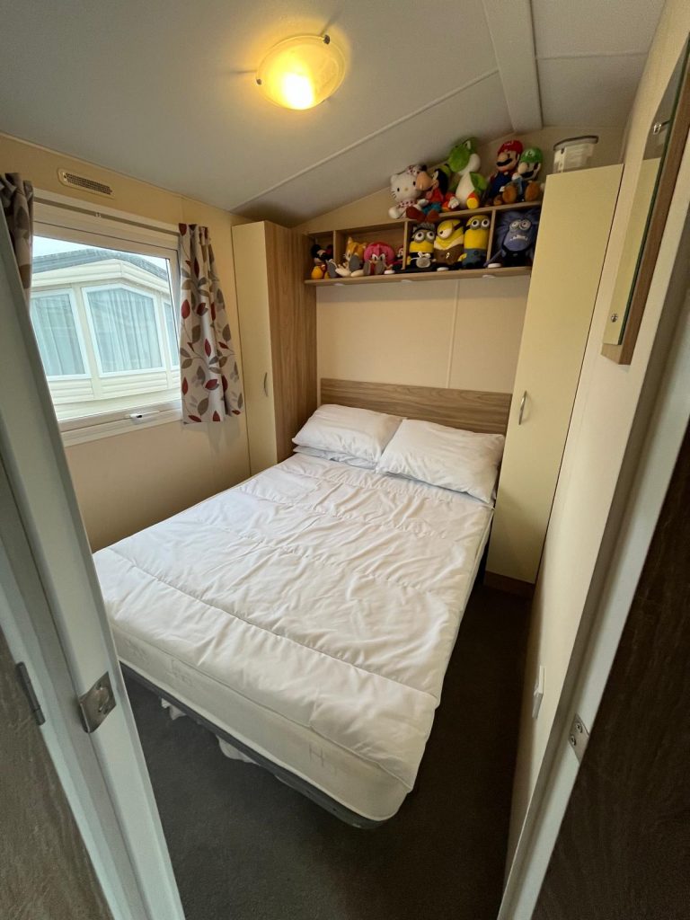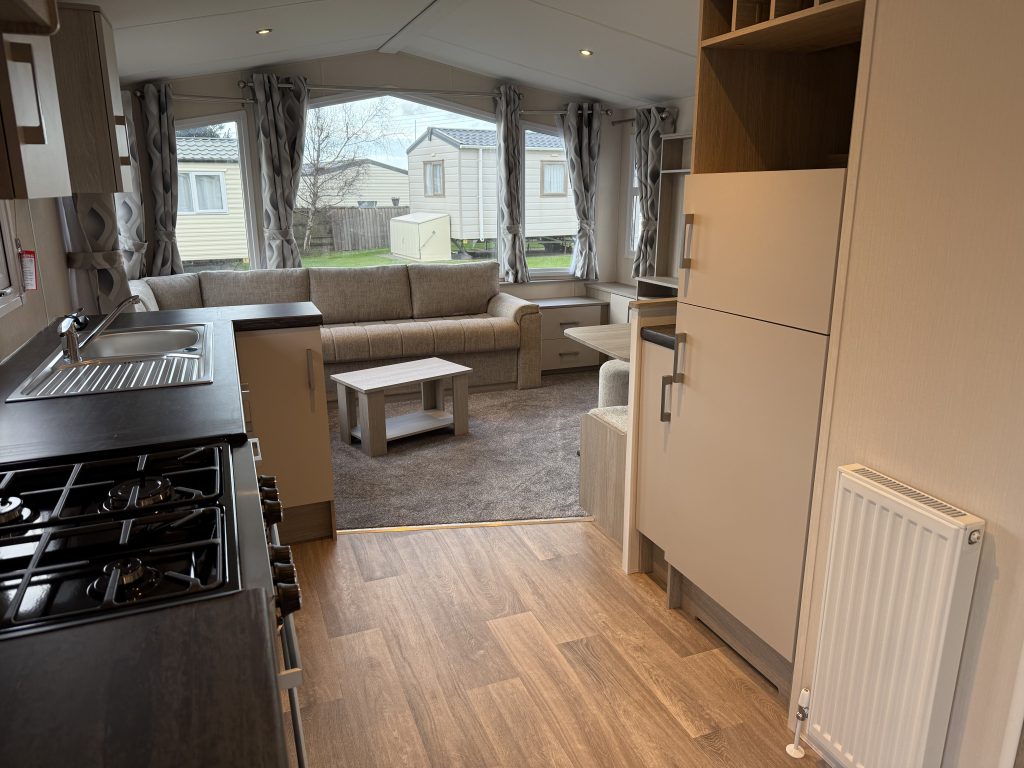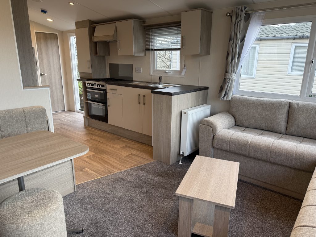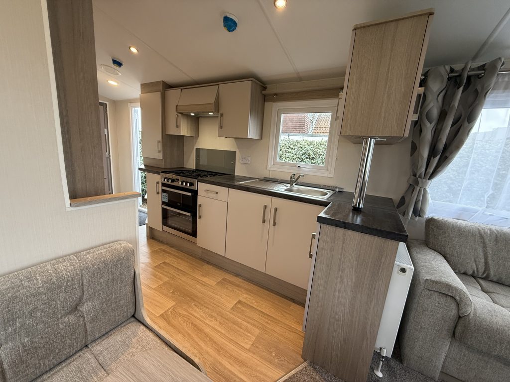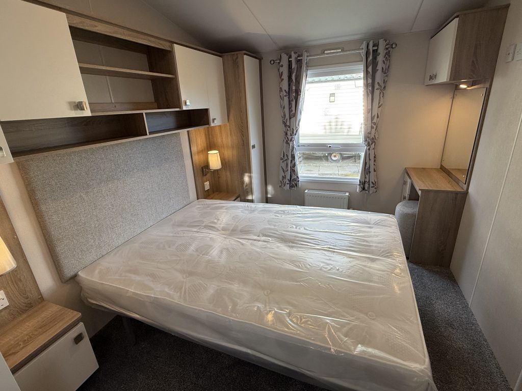 This nearly new 2 bed 6 berth caravan has electric plinth heaters and heated towel rail, under counter fridge freezer, cooker hood, outside light, pre galvanised chassis and large storage box.
