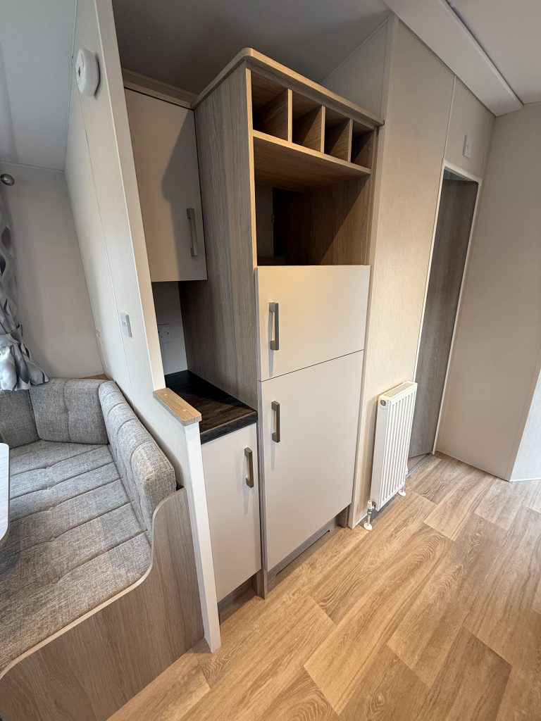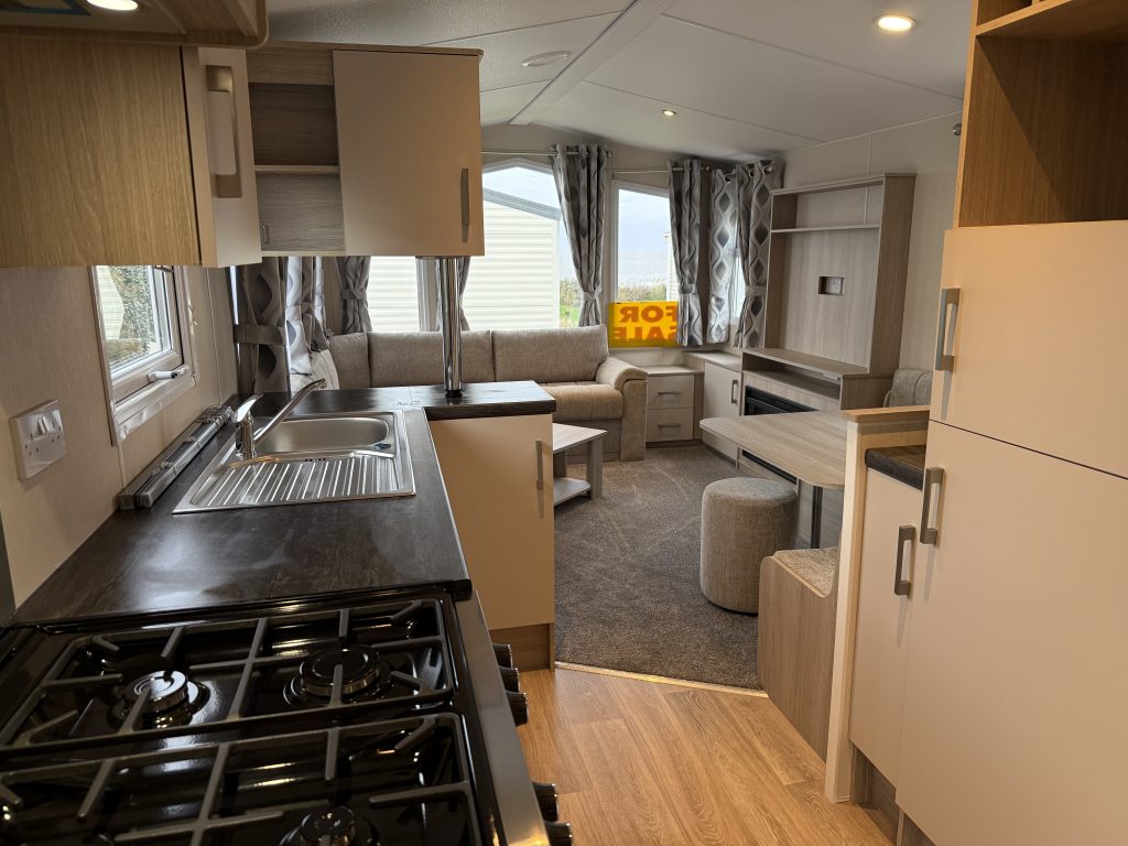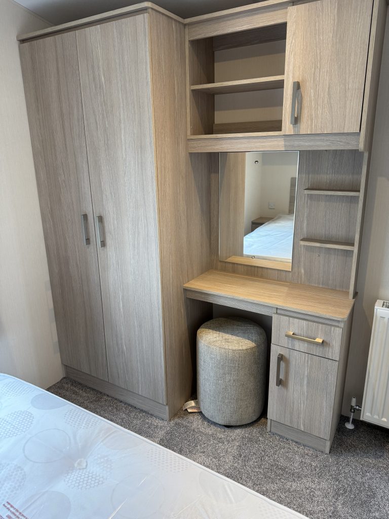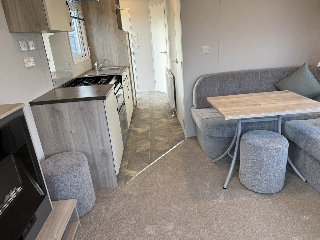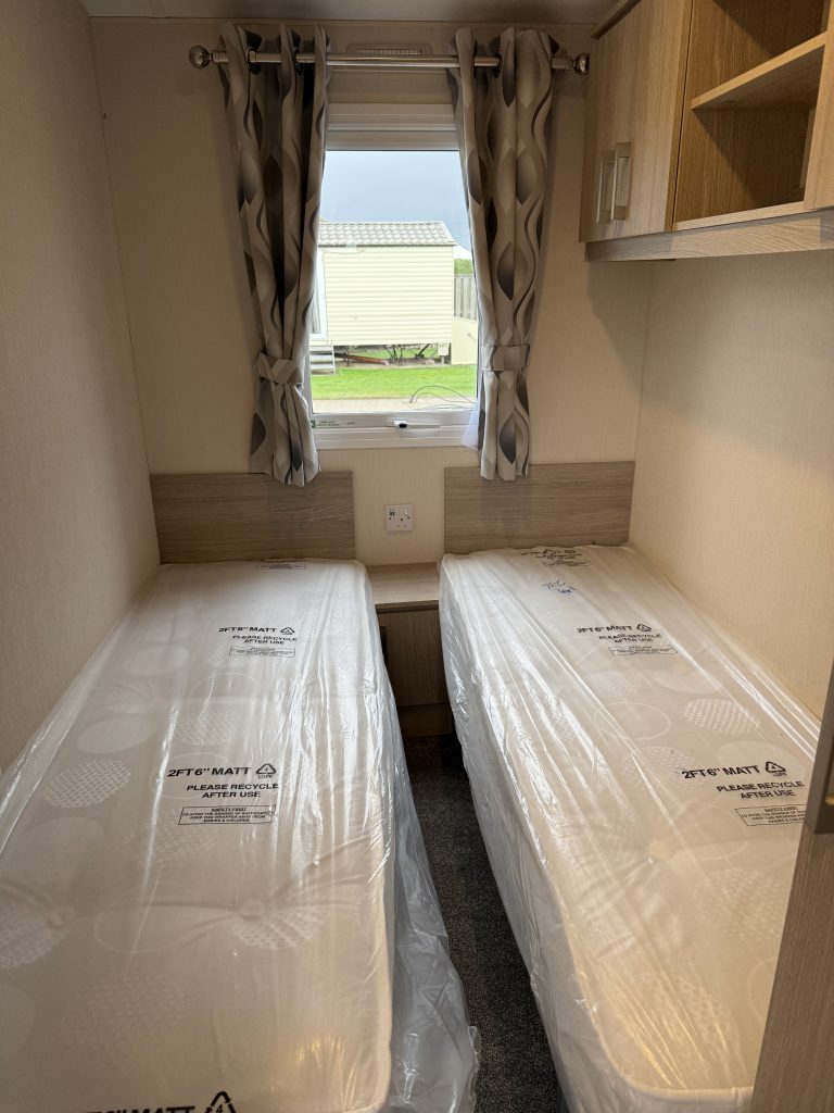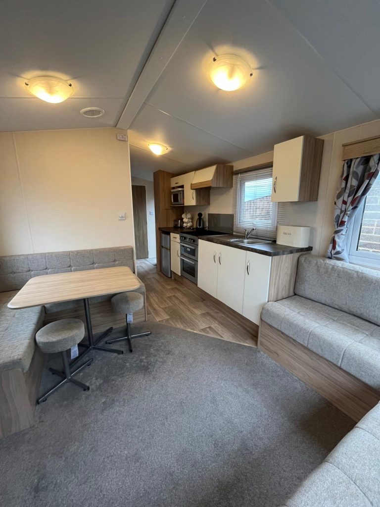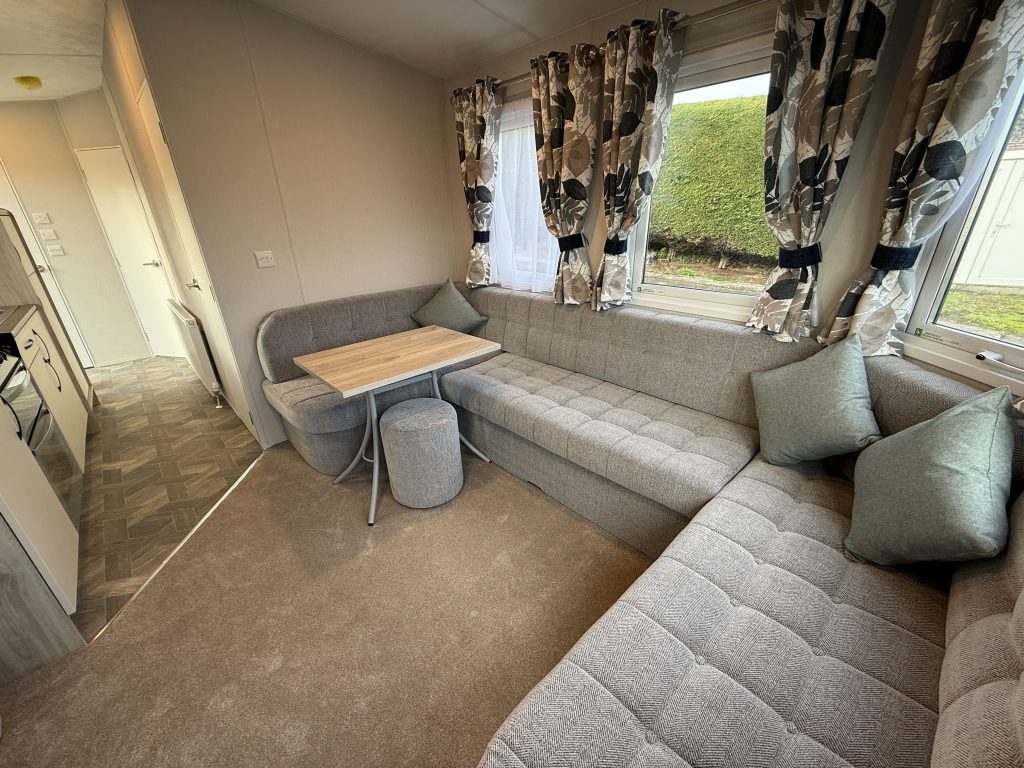 This nearly new 2 bed 6 berth caravan has electric plinth heaters and heated towel rail, under counter fridge freezer, cooker hood, outside light, pre galvanised chassis and large storage box.